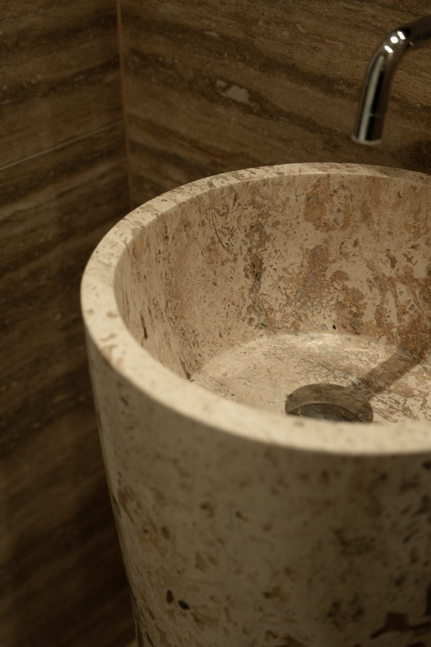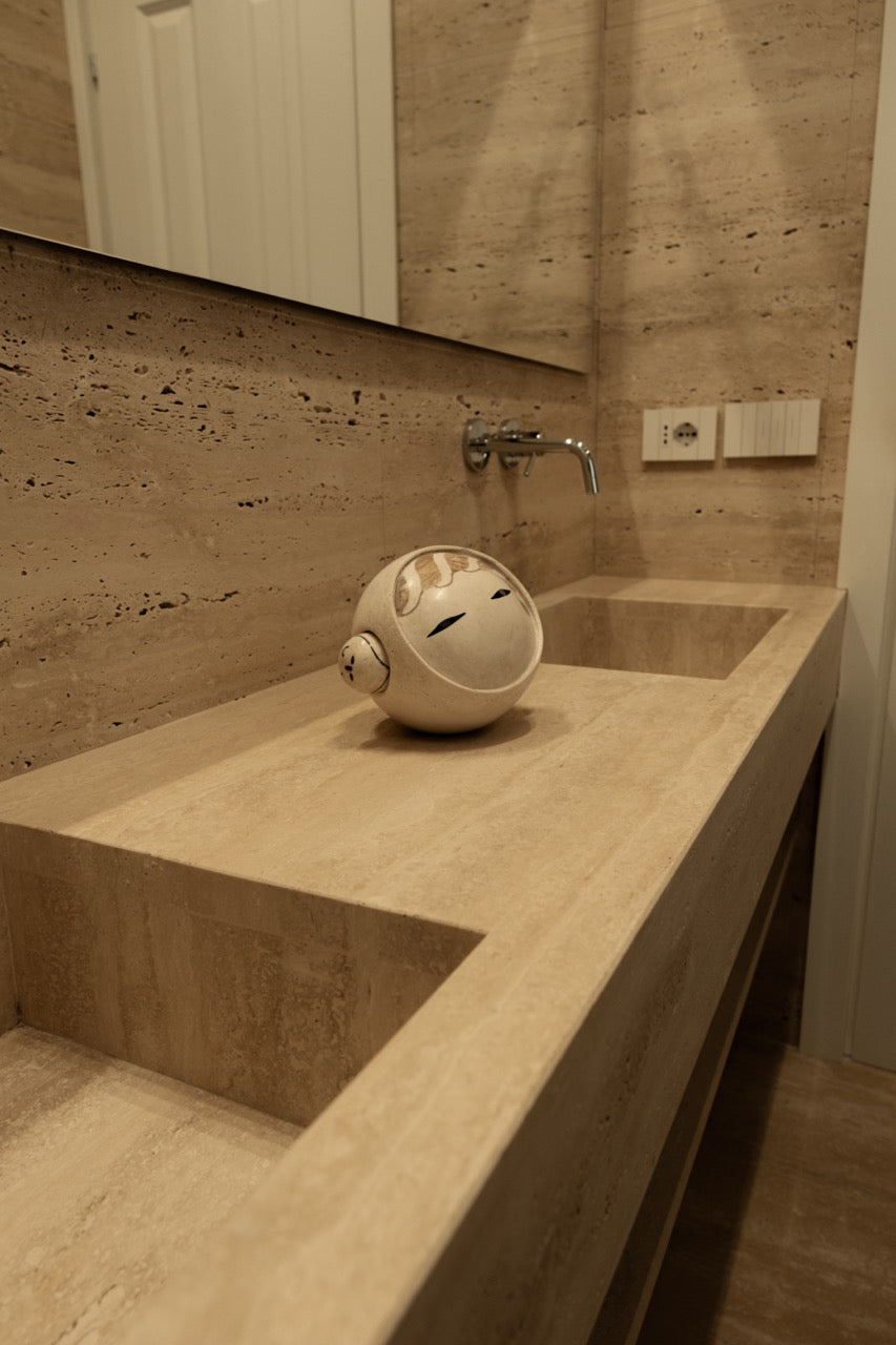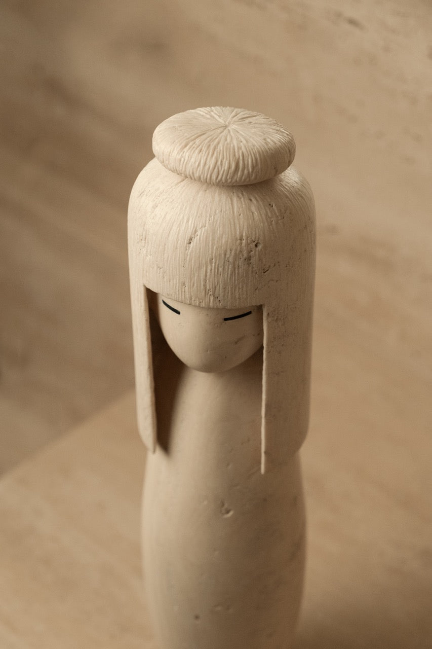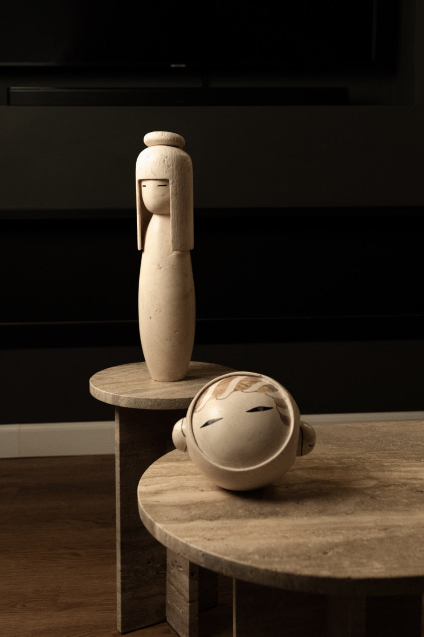 Kokeshi is carved from Roman travertine, selected for its warmth, porosity, and quiet depth. Each figure is shaped to preserve the stone’s natural texture and tonal variations—so no two pieces are ever identical.